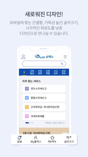 * 국세청 모바일 홈택스 [손택스] - 국세상담센터 (국번없이) 126 국세청 모바일 홈택스 [손택스] 앱에서는 회원가입, 세금신고·납부, 국세민원, 장려금 신청, 연말정산간소화 서비스, 현금영수증 사용내역조회, 전자세금계산서 발급 및 조회 등의 서비스를 제공합니다. 1. 손택스 회원가입 시 PC홈택스 서비스도 이용 가능. 2. 제공 서비스 (제공되는 서비스는 변경될 수 있습니다.) 1) 조회/발급 사업자등록 상태 조회, 전자세금계산서 발급, 현금영수증 조회, 연말정산간소화 자료조회, 공제신고서, 예상세액 계산하기, 전자고지 열람 등 2) 민원증명 즉시발급증명신청, 사실증명신청, 민원신청 결과조회 등 3) 신청/제출 근로장려금·자녀장려금 신청 및 조회, 사업자등록 신청, 일반 세무서류 신청, 송달장소 변경, 전자고지 신청/해지 등 4) 신고/납부 부가가치세 간편신고, 종합소득세 단순경비율 정기신고, 양도소득세 간편신고, 증여세 간편계산, 사업장현황 신고, 국세 납부 등 5) 상담/제보 모바일 상담하기, 방문상담예약, 탈세제보, 차명계좌 신고, 상담사례검색 6) My홈택스 세금포인트, 모범납세자, 세무대리정보, 민원처리결과 조회, 현금영수증 카드관리, 세금납부·환급·고지·체납내역, 체납안내문, 세무조사이력, 과세자료제출내역, 취업후 학자금 상환 내역 조회 등 3. 사용자가 자주 이용하는 메뉴를 My메뉴로 등록하여 편리하게 메뉴 이동 가능. 4. 관련사이트 바로가기를 통하여 국세 관련 타 서비스(국세청 홈페이지, 국세법령정보, 전국 세무서 찾기, 취업후 학자금 상환 등) 이용 가능. 5. 사용자가 직접 글자크기 조절 가능. 6. 공인인증서가 없어도, 지문으로도 로그인이 가능하여 간편하고 안전하게 서비스 이용. # 손 안에서 언제든지 세금 관련 서비스를 만나보세요! # 제작: 국세청 - 국세상담센터 (국번없이) 126