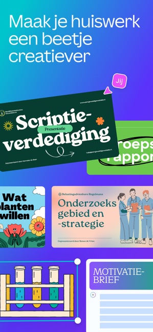 CREËER ALLES MET CANVA Canva is jouw alles-in-één creatief platform voor verbluffend grafisch ontwerp, fotobewerking en videocreatie. Van het maken van presentaties en visuele spreadsheets tot het ontwerpen van cv's en het creëren van sociale media-content, Canva stelt iedereen in staat om te ontwerpen als een professional. GEAVANCEERDE FOTOBEWERKER EN COLLAGECREATOR Transformeer je foto's met onze krachtige bewerkingssuite. Verwijder achtergronden moeiteloos met onze achtergrondgum, pas prachtige filters toe, pas helderheid en contrast aan en creëer opvallende fotocollages. Perfect voor sociale media, marketing of persoonlijke projecten. PROFESSIONELE VIDEO-EDITOR EN MOBIELE OPTIMALISATIE Maak boeiende video's met onze intuïtieve video-editor. Voeg ondertitels toe, pas filmische effecten zoals slow motion toe, synchroniseer je bewerkingen met muziek via Beat Sync en optimaliseer content voor mobiele weergave. Ideaal voor sociale media-reels, zakelijke presentaties of creatieve storytelling. Bewaar je beste werk met 5 GB voor iedereen. DYNAMISCHE PRESENTATIES EN DIAVOORSTELLINGEN Bouw meeslepende presentaties en diavoorstellingen met professionele sjablonen. Visualiseer gegevens effectief, ontwerp interactieve werkbladen voor onderwijs en creëer presentaties die je publiek boeien. Van bedrijfspresentaties tot universitaire opdrachten, laat elke dia tellen. OPVALLENDE CV-MAKER Creëer indrukwekkende cv's die resultaat opleveren. Blader door honderden professioneel ontworpen sjablonen, pas lay-outs aan om je persoonlijkheid te weerspiegelen en bouw documenten die de aandacht van werkgevers trekken. Essentieel voor werkzoekenden en carrièreontwikkeling. VISUELE SPREADSHEETS EN AUTOMATISERING MET BULK CREËREN Converteer gegevens naar overtuigende visuele spreadsheets en infographics. Benut AI-aangedreven Bulk Creëren om automatisch duizenden ontwerpvariaties te genereren voor reclamecampagnes en marketingmateriaal. Perfect voor bedrijven die hun creatieve output opschalen. UITGEBREIDE SJABLOONBIBLIOTHEEK Kies uit duizenden aanpasbare sjablonen voor sociale media-posts, visitekaartjes, flyers, uitnodigingen, logo's, memes en meer. Elk ontwerp is volledig aanpasbaar om te passen bij je unieke merk en creatieve stijl. REALTIME SAMENWERKING Werk naadloos samen met teamleden in real time. Deel ontwerpen direct, verzamel feedback en werk samen aan projecten vanaf elke locatie. Ideaal voor creatieve teams, studenten en professionele organisaties. ONTKETEN JE CREATIVITEIT Krijg toegang tot duizenden hoogwaardige sjablonen, afbeeldingen en ontwerpelementen. Creëer professionele ontwerpen met krachtige AI-functies en breng je creatieve visie tot leven met toonaangevende tools. CANVA VOOR ONDERWIJS Transformeer je onderwijs met een door school en district beheerde Canva-ervaring die is gebouwd voor de klas. Creëer boeiend visueel lesmateriaal met ingebouwde moderatie en leeftijdsgeschikte controles voor veilige, collaboratieve lessen. Gratis voor in aanmerking komende K-12 leraren en studenten. Gebruikersvoorwaarden: https://www.canva.com/policies/terms-of-use/ Privacybeleid: https://www.canva.com/policies/privacy-policy/
