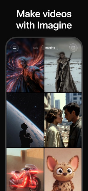 Grok is an AI-powered assistant, developed by xAI, designed to be maximally truthful, useful, and curious. Get answers to any question, generate striking images and videos, and let Grok search the web and X for you to gain a deeper understanding of the world. With Grok, the universe is in your hands! AI assistant - Ask anything and get fast replies, have Grok do deep research on the web for you, or solve the hardest problems in math, science, and coding with Grok 4. - Upload documents and photos, or paste links in the chat to have Grok analyze or help you understand the content. Grok Imagine - Imagine is a new, super fast, groundbreaking AI image and video generation experience. - Generate 6-second videos with sound from text prompts, and turn static photos into videos. - Generate AI images using only your voice. Grok Voice Mode - Talk to Grok using your voice and get natural sounding replies as if you’re having a conversation with a human. - Live Camera: If you want Grok to see what you see, you can use Voice Mode with Live Camera to share your view in real-time. - Personalize your AI Assistant and choose between different personalities, like Assistant, Romantic, Storyteller, and more. Grok AI Companions - Have a chat with Ani, Rudi, or Valentine, our animated AI characters, each bursting with personality, - Rudi is a cheeky red panda with a sense of humor that you can banter with. - Valentine is a romantic male with poetic charm, perfect for deep and soulful conversations. - Ani is a charmer who blushes and sends hearts as your bond grows. Real-time info from X - With access to X (previously Twitter) and web data, Grok is the AI assistant with the most up-to-date information, keeping you informed about the latest news and trends in the world, for any given topic. - You can also ask Grok to do advanced searches for you on X, letting you dive even deeper into what’s happening and what people are saying. Create and edit images - Generate striking images from simple text prompts, or upload images and ask Grok to edit them. - Remove objects, change the scenery, or apply any art style, like Ghibli or Anime. With Grok as your copilot and personal AI assistant, navigating the vast expanse of knowledge becomes exciting! Tap into X’s live trends, fire off bold questions, have fun conversations with AI Companions, or use the new AI image and video generation tool Imagine to explore your boundless creativity. Terms of Service: https://x.ai/legal/terms-of-service Privacy Policy: https://x.ai/legal/privacy-policy Grok by xAI